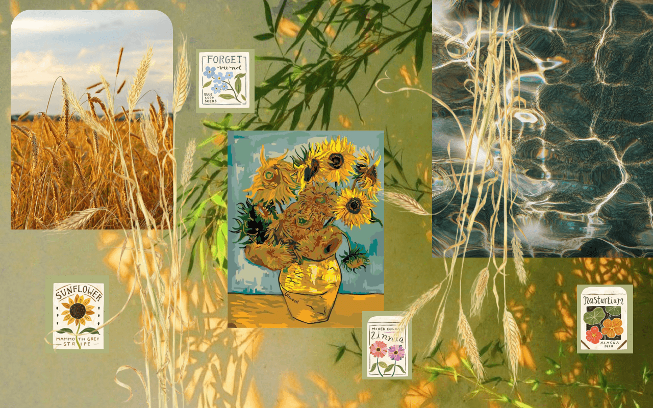 Organic elements (wheat, hand-drawn florals) to emphasize nourishment and natural movement