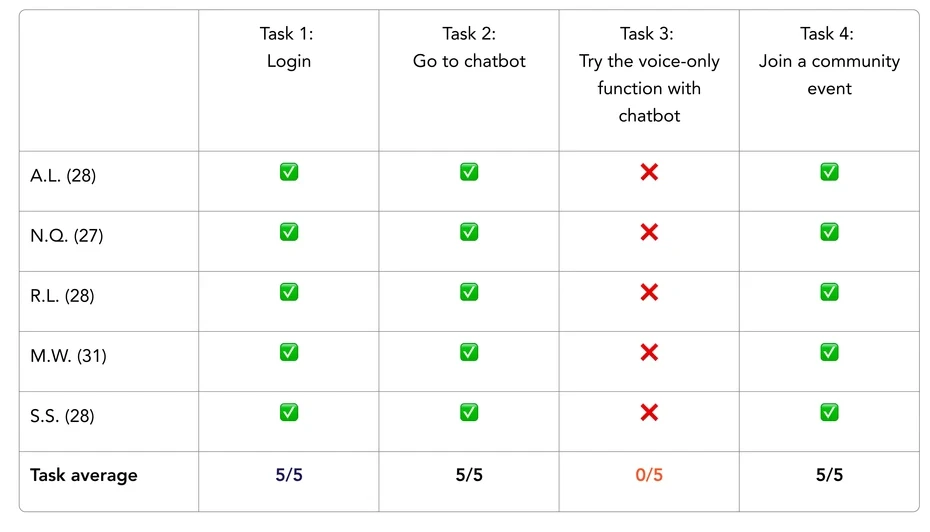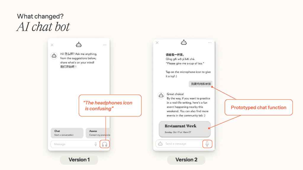 Testing showed that users repeatedly missed or misunderstood the microphone and voice-only icons. Adjusting their placement and clarity led to major improvements in task completion and navigation.