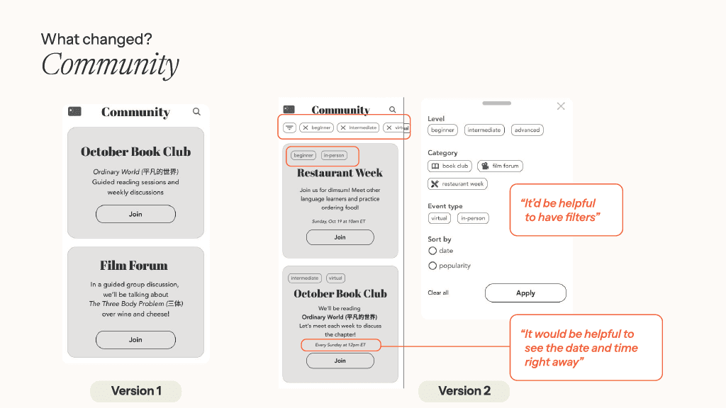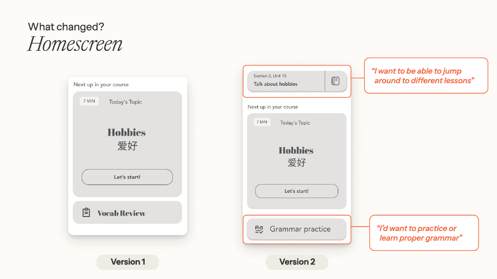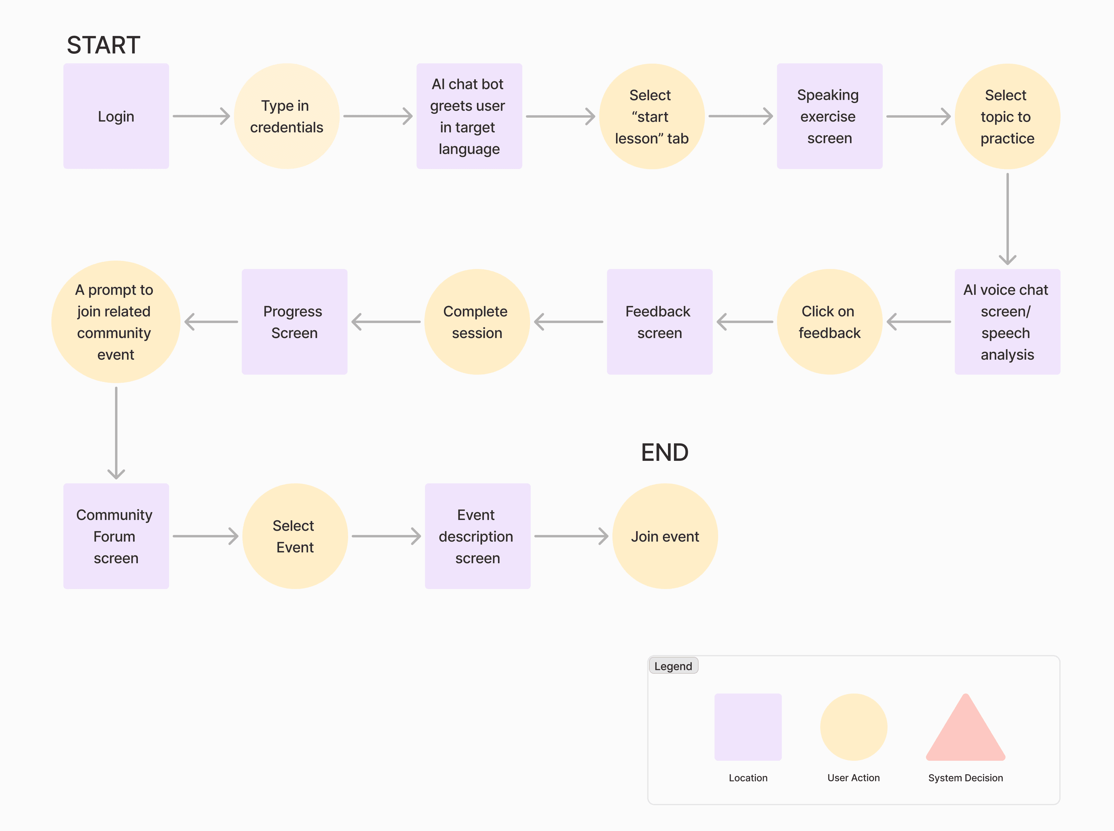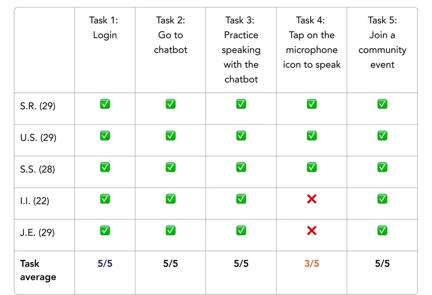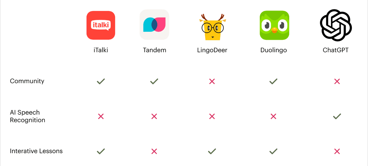 Competitive analysis also revealed a gap: no major language app combines real-time speech practice, instant feedback, and community support in one platform.