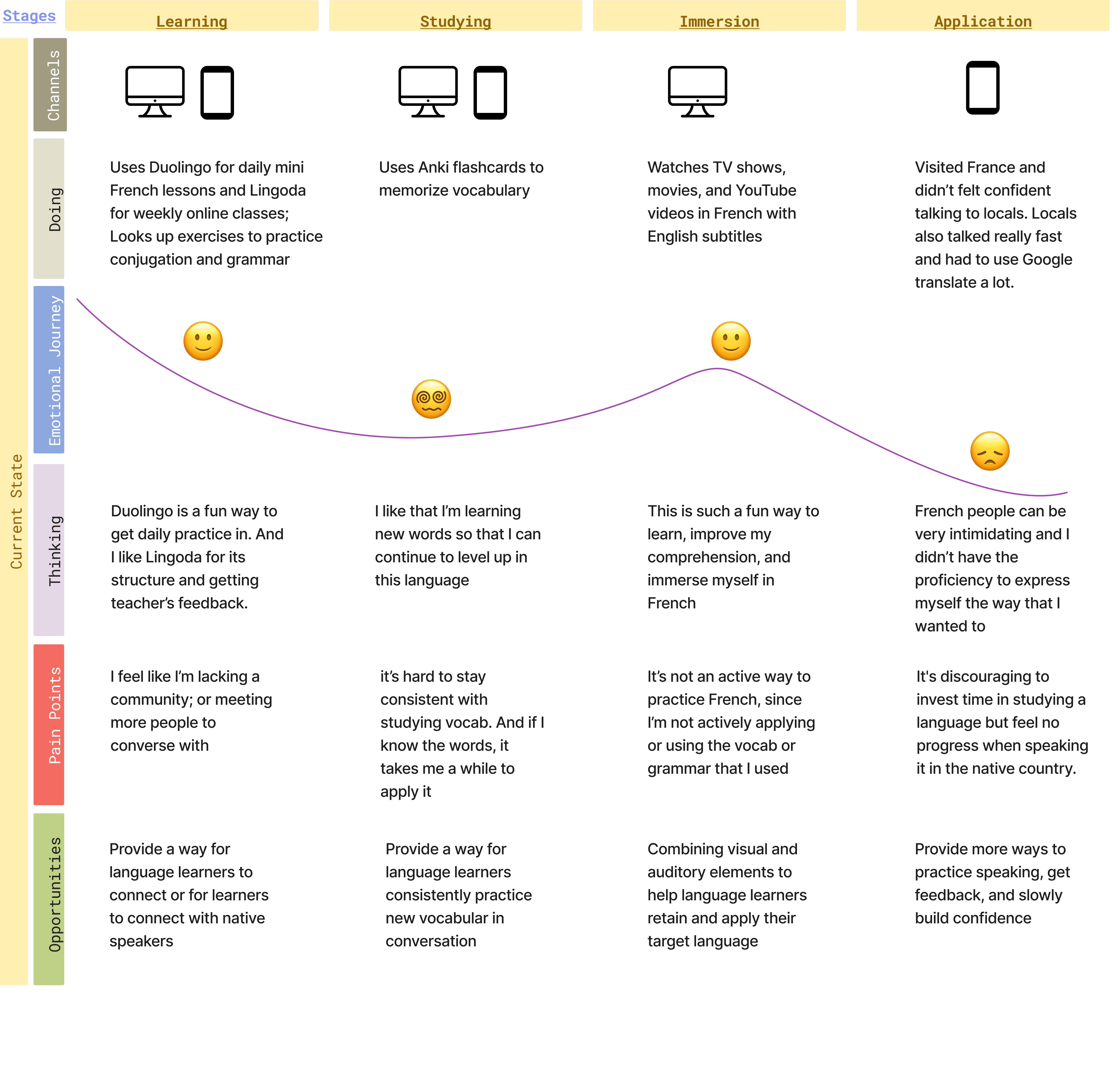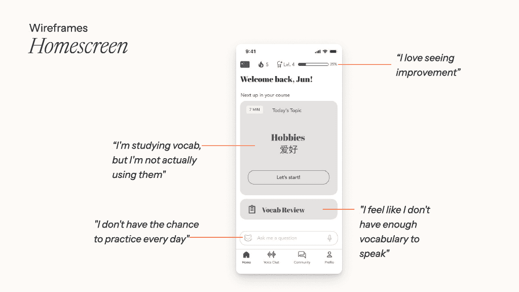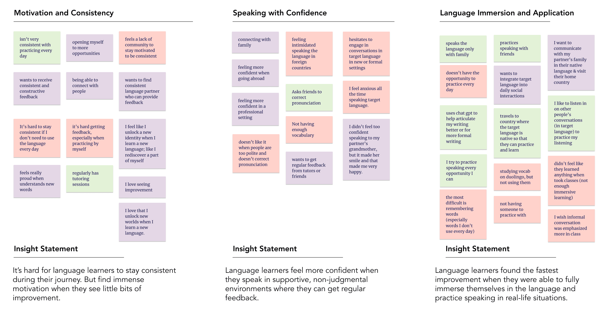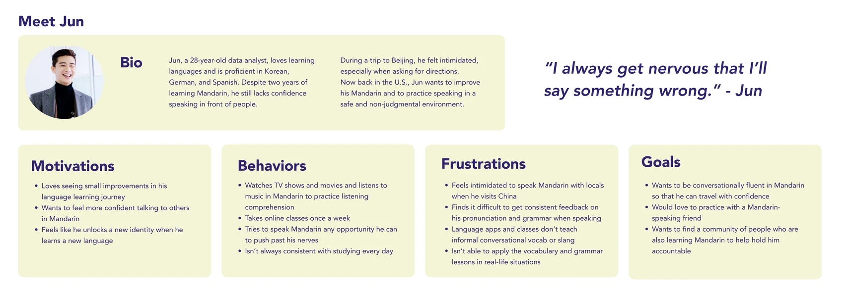 From user interviews with 8 learners, immersion and real-time speaking practice emerged as the strongest unmet needs. Learners wanted to practice in low-pressure scenarios, get instant feedback, and build confidence before speaking to others.