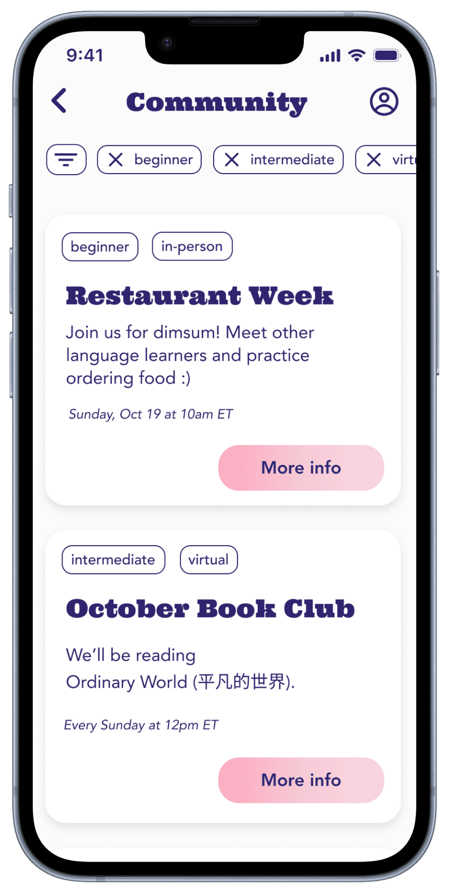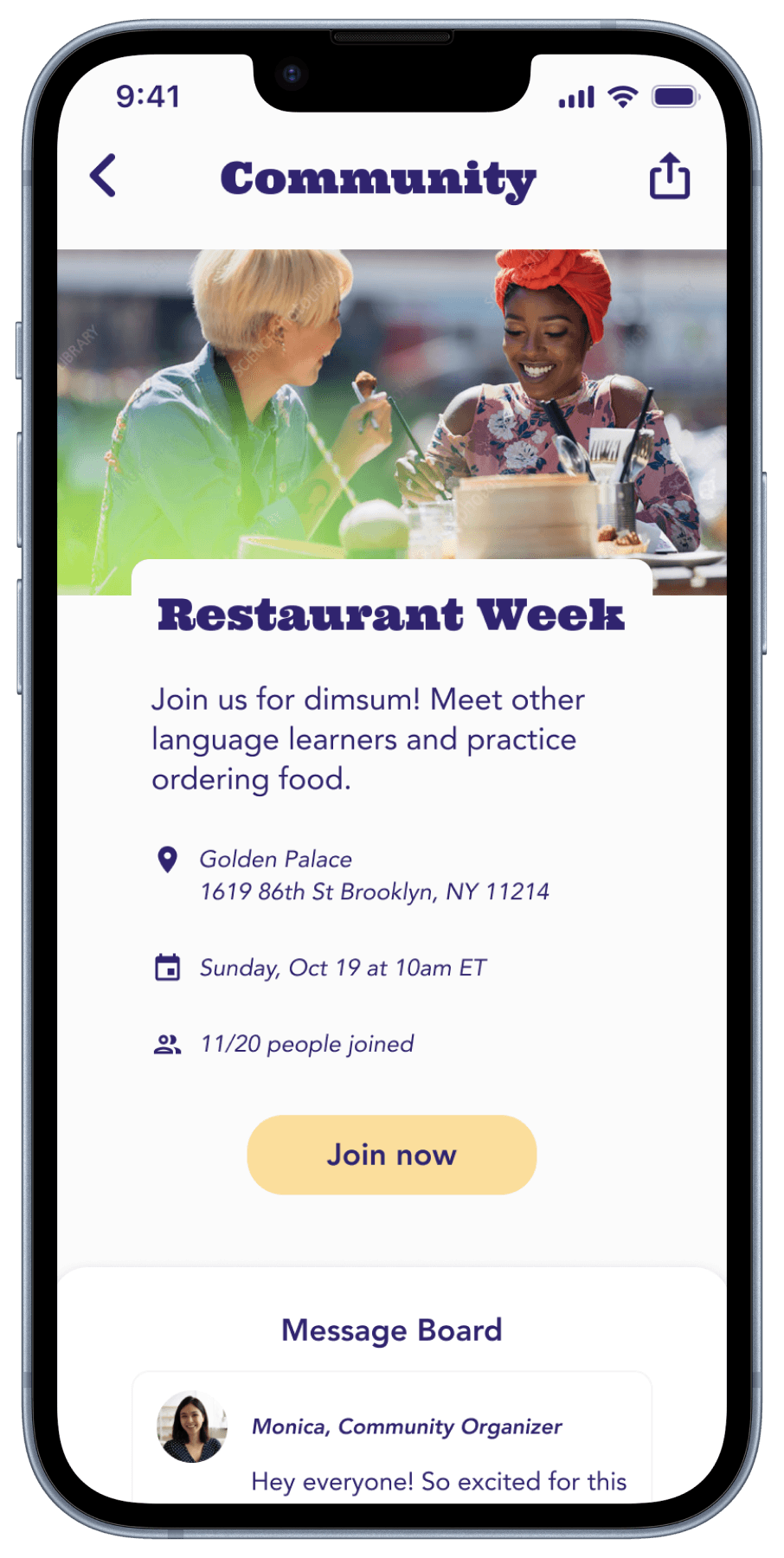 A community forum to find nearby cultural and language events, helping learners apply their skills in supportive environments